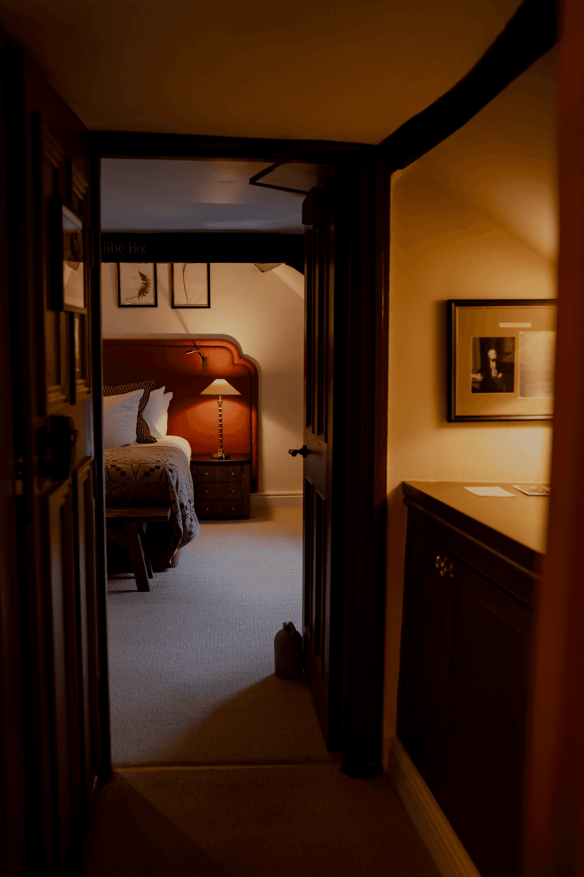 The Beaufort Suite is a study in warmth and texture, where wooden columns and elegantly striped curtains frame a space designed for comfort and ease. A rainfall shower adds a touch of indulgence, while a rich palette of warm tones creates an inviting, cocooning atmosphere throughout. At the end of the hall, a quiet lounging area awaits. An intimate spot to pause, savour a cup of tea, and retreat for a moment of calm between dining and the day’s pursuits.