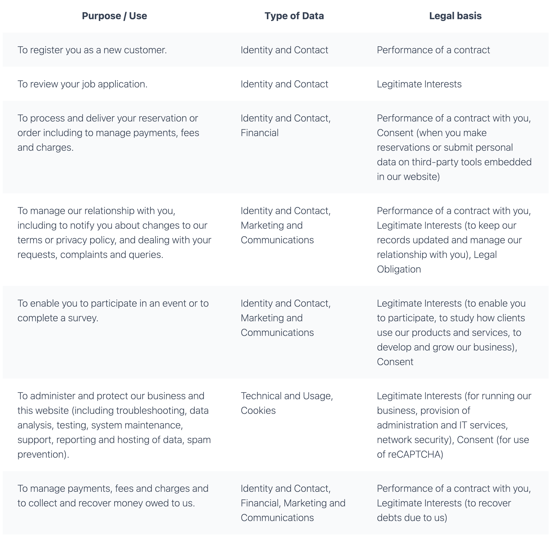 We have set out below, in a table format, a non-exhaustive list of the ways we plan to use the various categories of your personal data and which of the legal bases we rely on to do so. We have also identified what our legitimate interests are where appropriate.